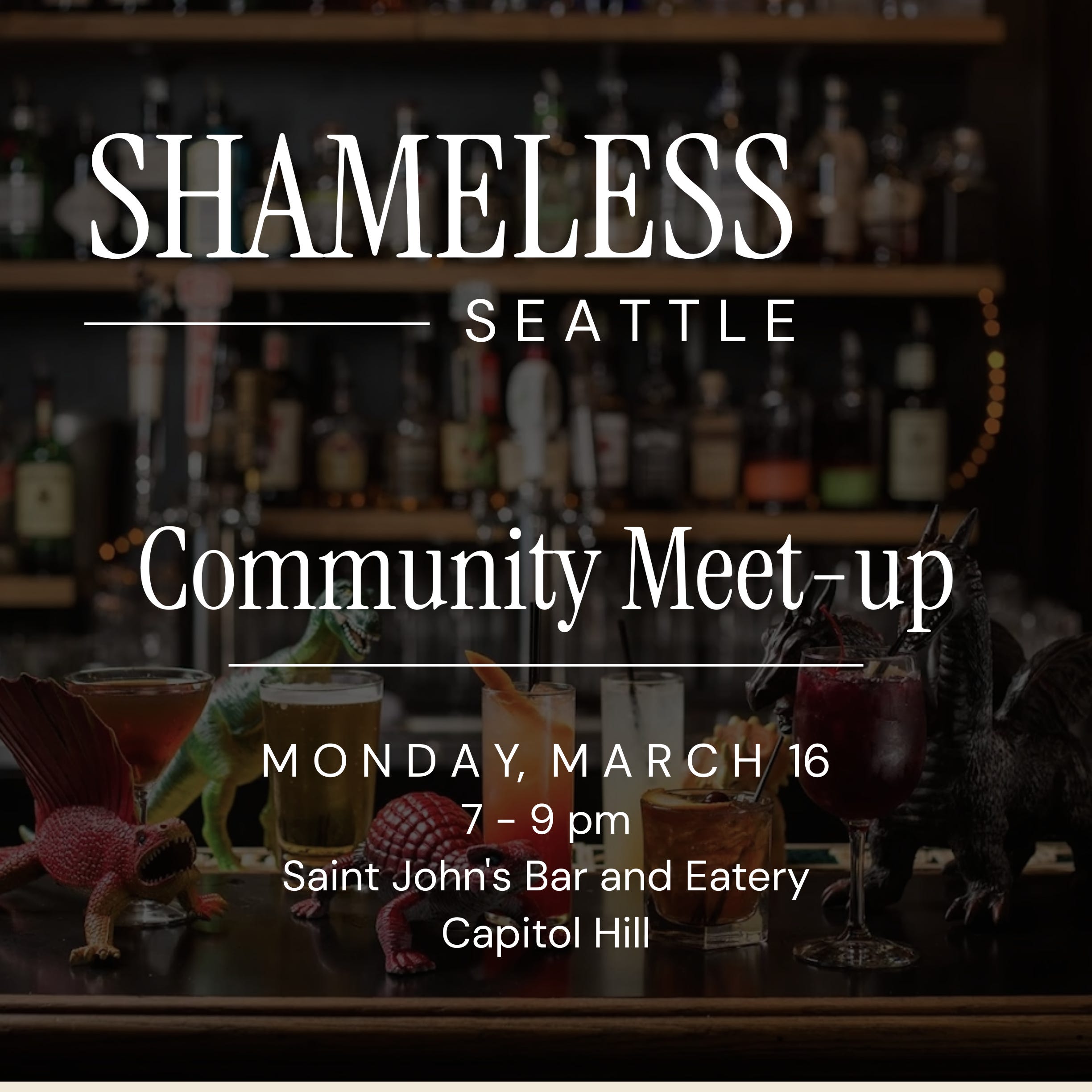 Our first event is happening on Monday, March 16 at Saint John’s Bar and Eatery in Capitol Hill, Seattle.